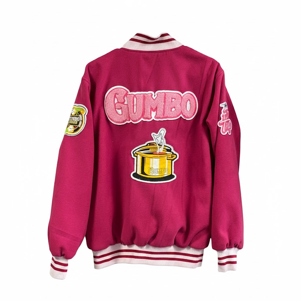 Statement-making pink varsity jacket with luxurious Gumbo embroidered details. Bold style meets premium quality